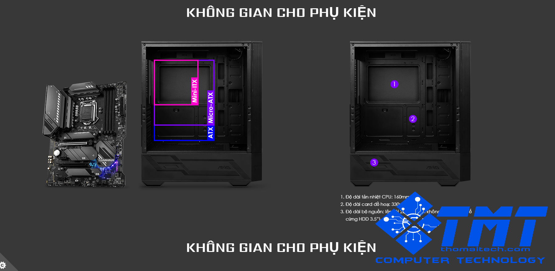 Độ dài bộ nguồn: lên tới 200mm (khi không gắn khe lắp ổ cứng HDD 3.5”)
