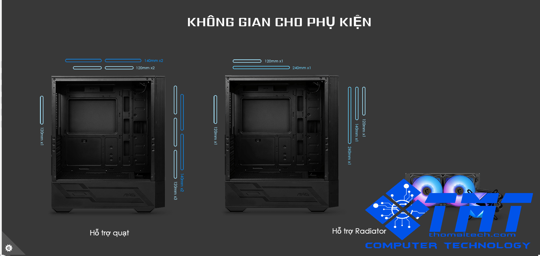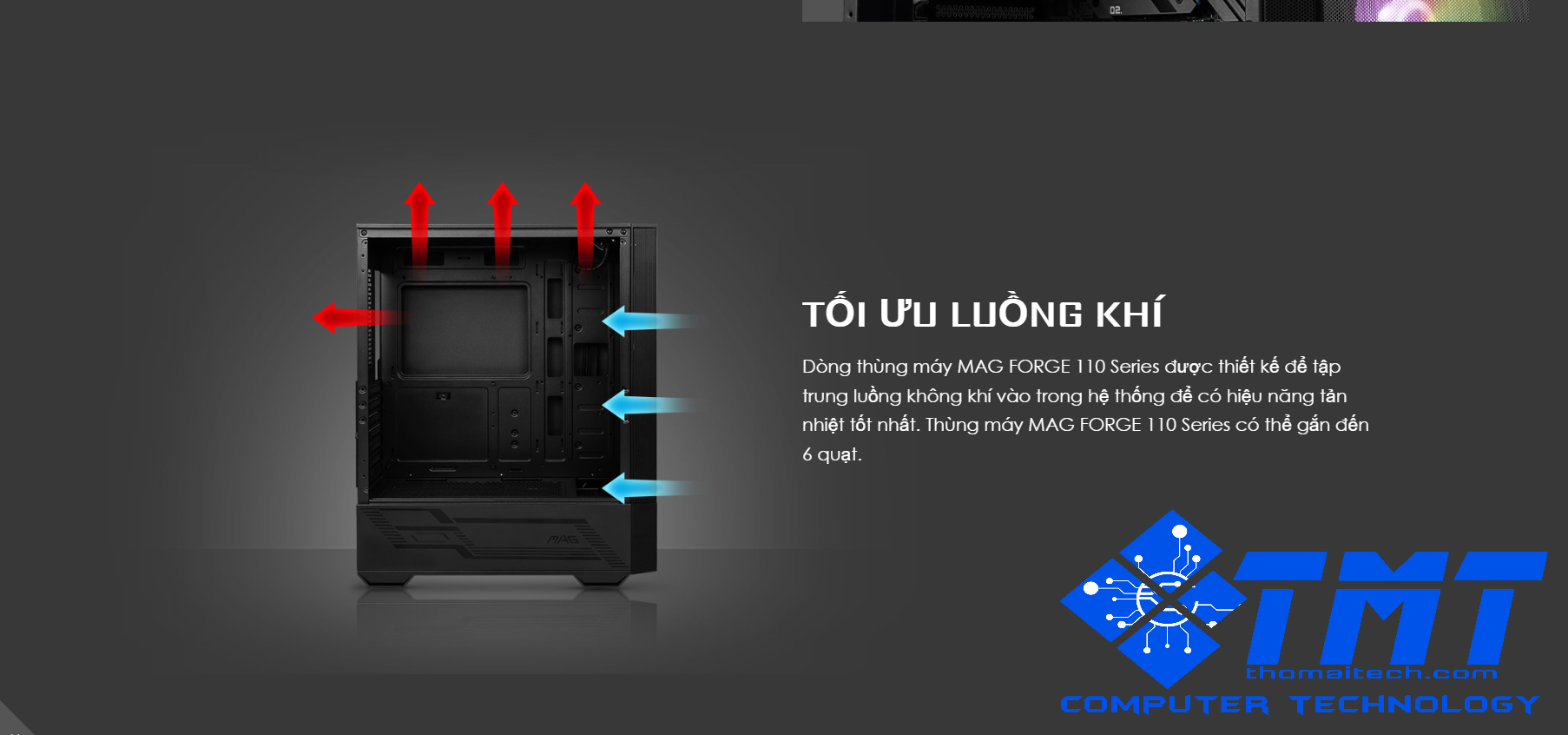 Dòng thùng máy MAG FORGE 110 Series được thiết kế để tập trung luồng không khí vào trong hệ thống để có hiệu năng tản nhiệt tốt nhất. Thùng máy MAG FORGE 110 Series có thể gắn đến 6 quạt.