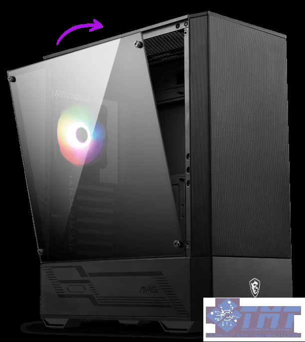 Thùng máy MAG FORGE 110R được thiết kế cho phép người dùng gắn/gỡ kính cường lực dễ dàng. Chỉ cần đặt tấm mặt bên lên trên gốc chặn dưới của thùng máy trước khi gắn vào, vô cùng đơn giản.