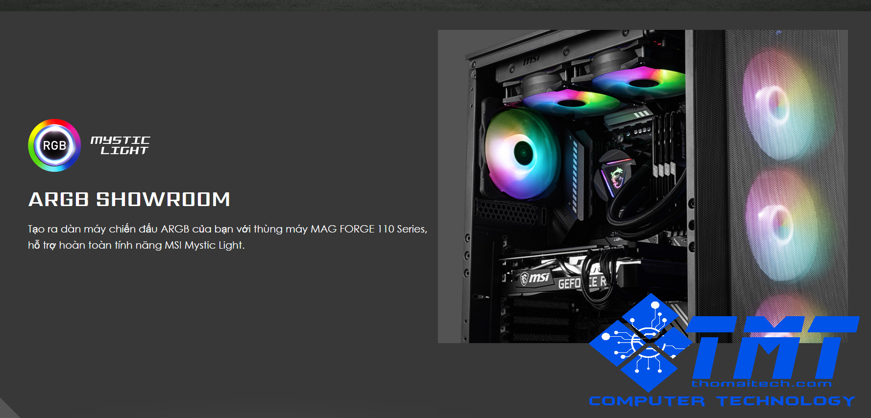 Tạo ra dàn máy chiến đấu ARGB của bạn với thùng máy MAG FORGE 110 Series, hỗ trợ hoàn toàn tính năng MSI Mystic Light.