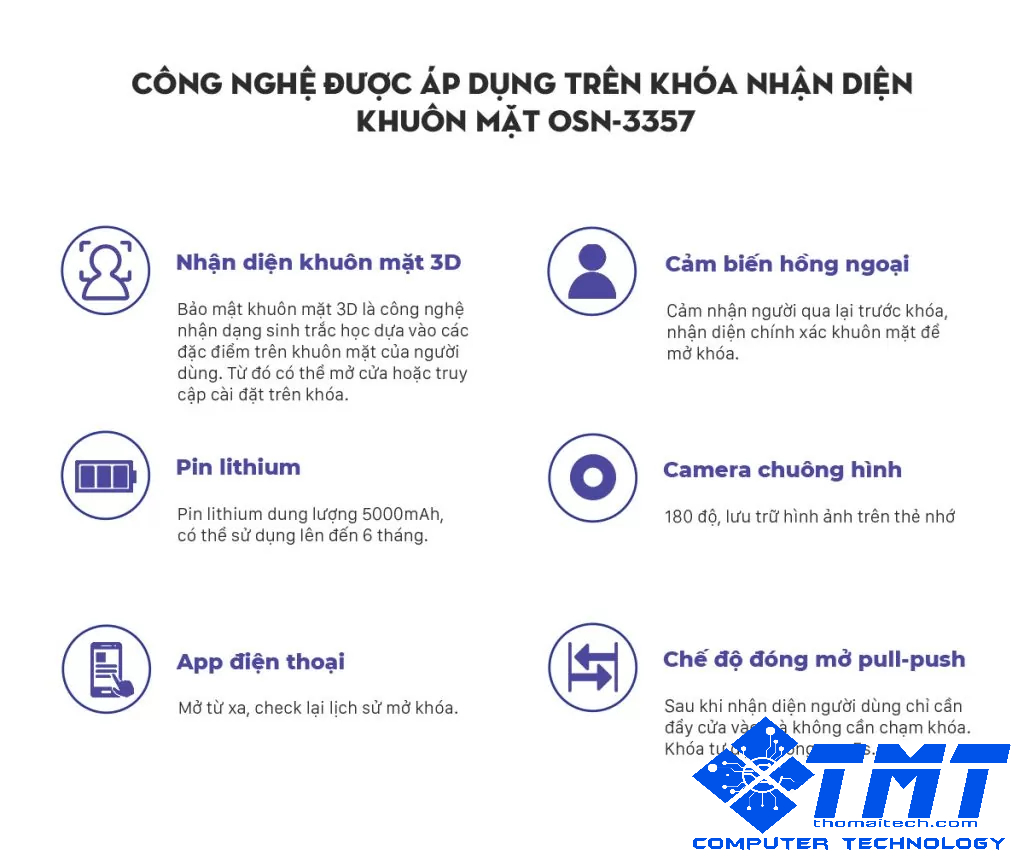 Dòng sản phẩm mới của OSUNO có tính năng nhận dạng khuôn mặt 3D tiên tiến và một ứng dụng từ xa, được gọi là OSN-3357. Với sáu tính năng khóa hiện đại, bao gồm nhận dạng khuôn mặt, vân tay, mật khẩu, thẻ ra vào, chìa khóa vật lý và ứng dụng điện thoại, mẫu này là một khóa kỹ thuật số toàn diện. Nó cung cấp một máy ảnh, đóng mở kéo đẩy và pin sạc. Ngoài ra, nó tự hào có dung lượng bộ nhớ ấn tượng lên tới 100 người dùng. An toàn và riêng tư, rất phù hợp cho những gia đình có người già hoặc trẻ nhỏ. Các sản phẩm của OSUNO được sản xuất theo tiêu chuẩn công nghệ Nhật Bản, được bảo hành 24 tháng, miễn phí tư vấn, lắp đặt tận nơi. Chọn OSUNO cho nhu cầu khóa kỹ thuật số của bạn!
