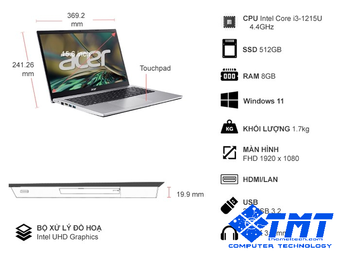 Laptop Acer Aspire 3 A315-59-381E Bạc 15.6 FHD I3-1215U 8GB 512GB
