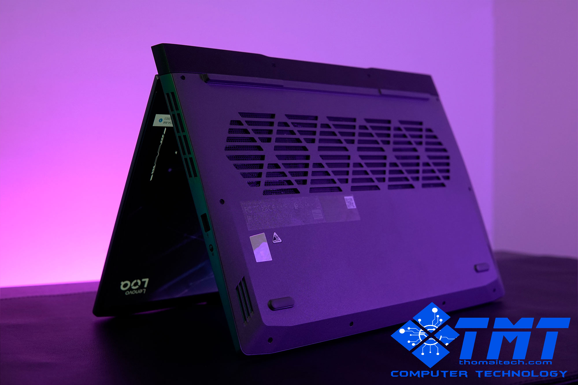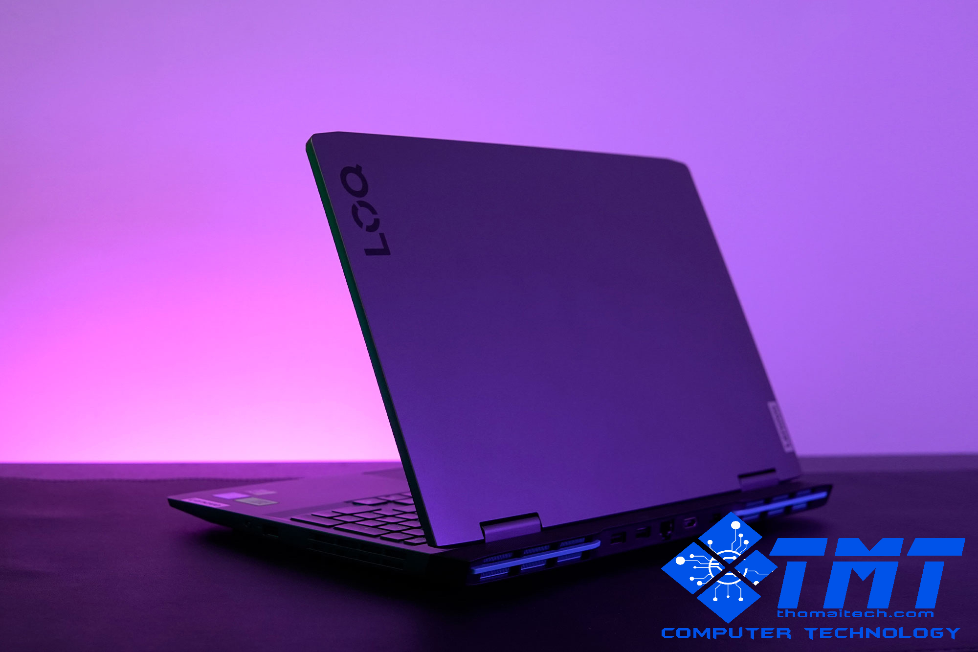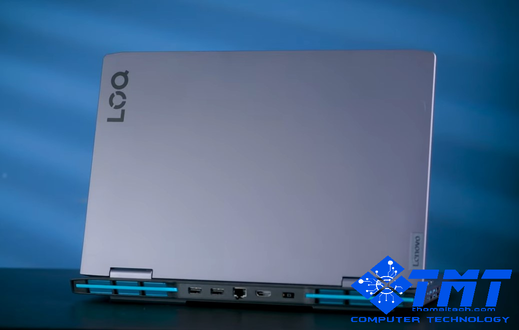 Về cơ bản, thiết của của Lenovo LOQ rất giống với dòng Legion với các hốc tản nhiệt to và dày bản phía sau. Phần bản lề màn hình được thụt vào một đoạn so với khung máy cùng với vị trí các cổng kết nối gần như giống hoàn toàn với dòng Legion với các công USB type A và USB type C ( không có thunderbolt)