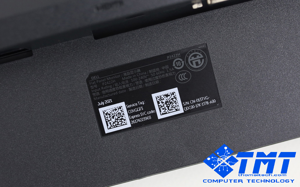Nhìn từ góc này, các bạn có thể thấy được rõ ràng các kí hiệu nhận biết về các cổng cắm kết nối cùng với một số thông tin về chiếc màn hình như là Flat Panel Monitor, Made in China, Input Rating, Manufactured Date, Service Tag, Express SVC Code và Serial Number.
