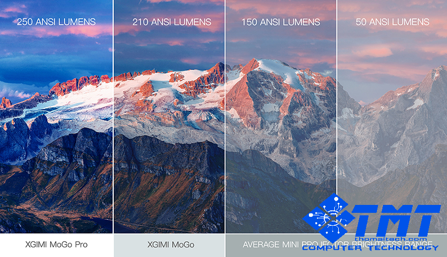 * Không giống như các máy chiếu Pico hay các hãng vốn có trên thị trường có độ sáng thấp khiến hình ảnh mờ và hạt ( 50-150) trong khi XGIMI Mogo Pro cung cấp tới 250-300ANSI Lumen điện và Mogo Cung cấp 210 ANSI Lumen tạo nên sự khác biệt về hình ảnh : tuyệt đẹp rõ ràng.