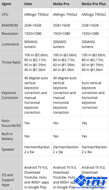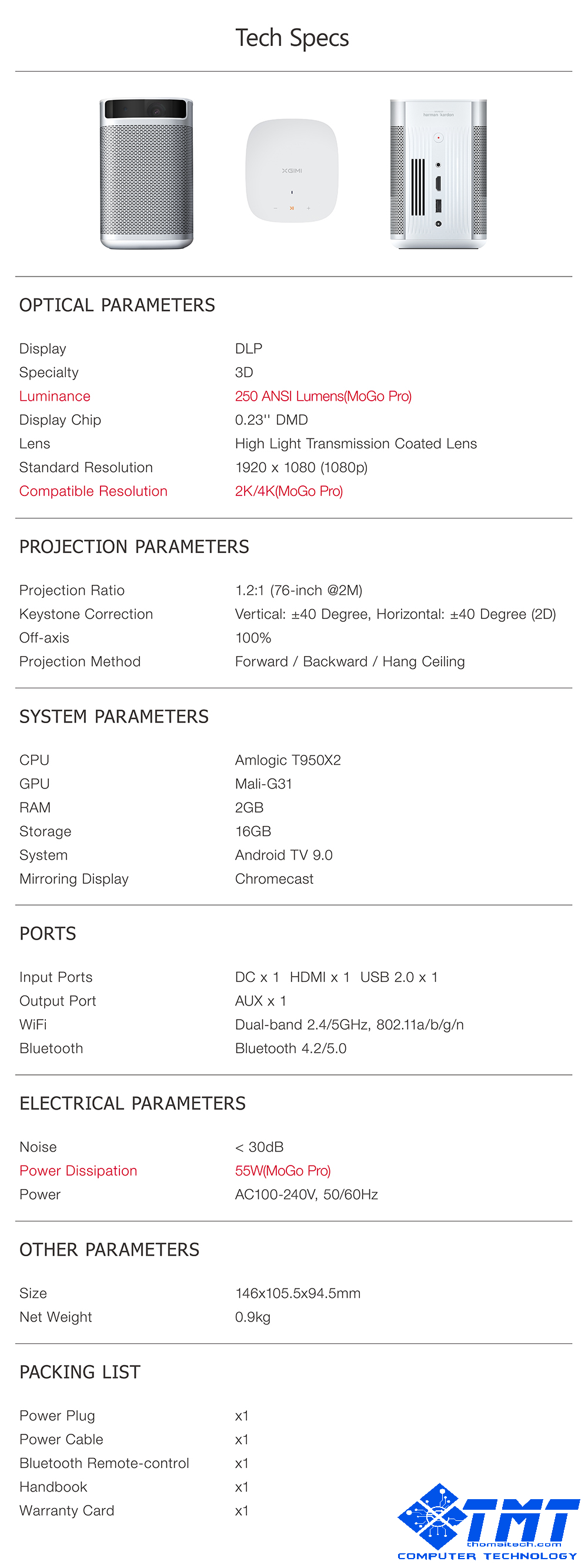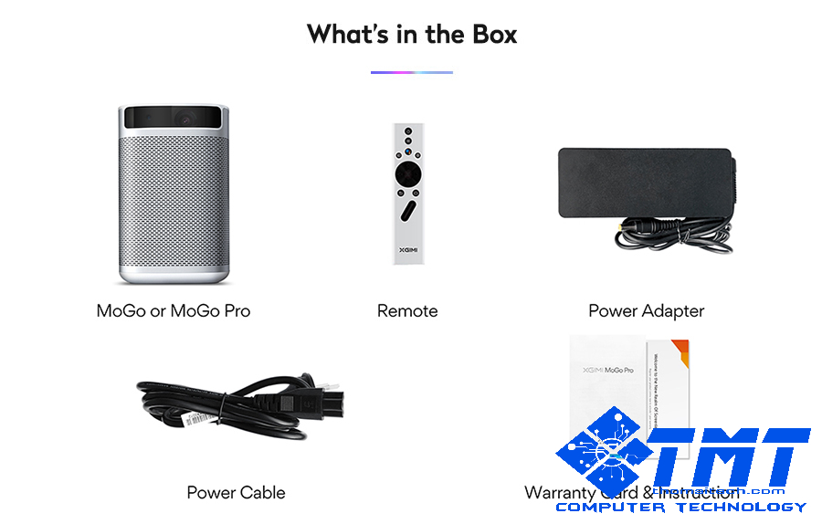 - Cấu hình máy chiếu Xgimi MOGO PRO: CPU: AMLOGIC T950X2 / GPU: MALI-G31 / RAM: 2GB / Lưu trữ: 16GB / Hệ thống: Android 9.0 / Tiếng ồn: < 30DB / Kích thước: 146*105.5*94.5mm