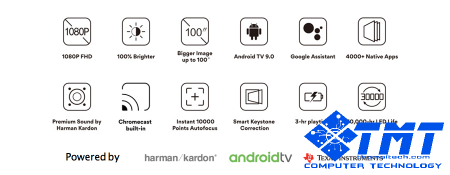 Đây là chiếc máy chiếu di động được trang bị những công nghệ tiên tiến nhất với hệ điều hành HD Android TV,chất lượng âm thanh cực chất với hệ thống loa Harman/Kardon