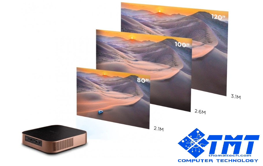 Thiết lập giờ trở nên dễ dàng hơn bao giờ hết với chức năng thu phóng kỹ thuật số 0,8X-1,0X. Bạn có thể thu nhỏ hoặc phóng to hình ảnh chiếu để tạo ra kích thước màn hình mong muốn từ cùng một khoảng cách, mà không cần phải di chuyển máy chiếu. Hình chiếu lên đến 100” từ khoảng cách chỉ 2,6 m.