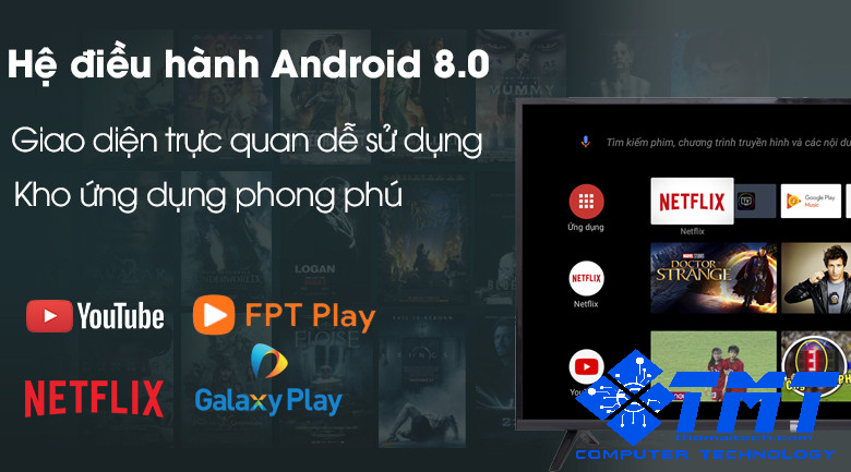 Android tivi TCL chạy hệ điều hành Android 8.0 mới nhất cùng với kho ứng dụng Google Play phong phú, đa dạng: YouTube, Netflix, Zing TV, FPT Play, Clip TV,... đáp ứng mọi nhu cầu xem phim, nghe nhạc giải trí.
