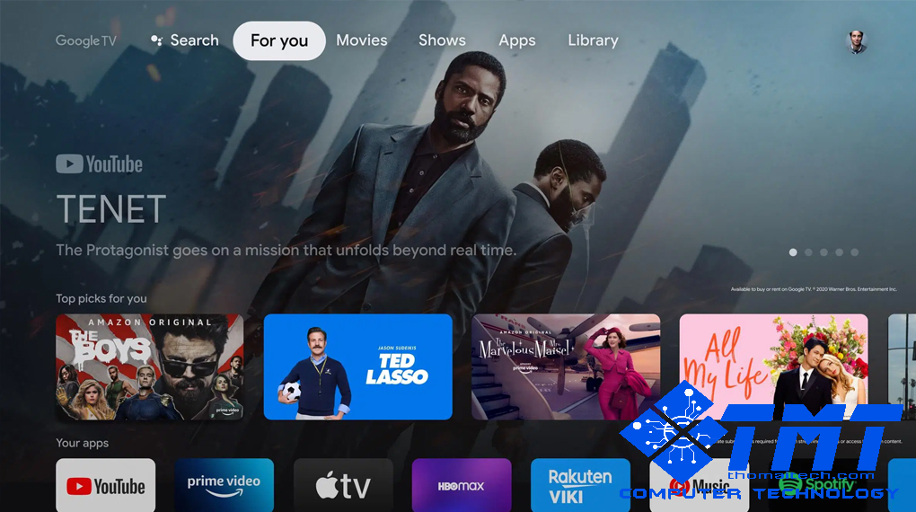 - Hệ điều hành Google TV có thiết kế giao diện hiện đại, sắp xếp các nội dung vào những tab riêng để bạn theo dõi, tìm kiếm, truy cập tiện lợi.