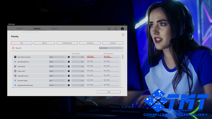 MSI GAMING LAN Manager tự động phân loại và ưu tiên các ứng dụng nhạy cảm với độ trễ, mang đến cho bạn trải nghiệm chơi game trực tuyến có độ trễ thấp tuyệt vời.